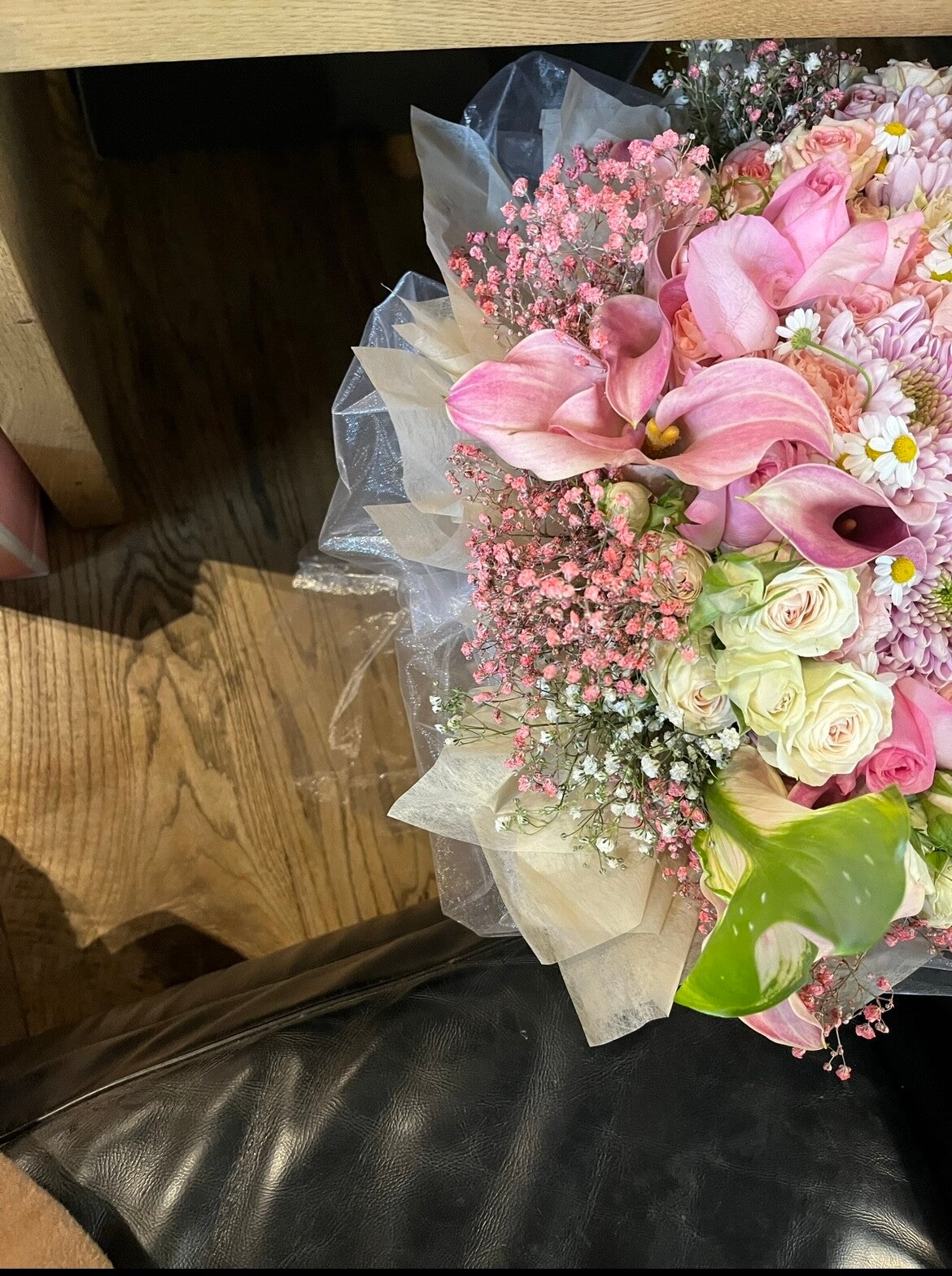 Onze klant had dit boeket besteld voor zijn toekomstige. Degene die dit boeket had ontvangen, was verrukt door de schoonheid en de zorg die in de selectie van de bloemen zijn gestoken. Onze doel was een glimlach toveren op hun gezicht en hun hart verwarmen door de liefdevolle boodschap die dit boeket uitdraagt. 🌸✨